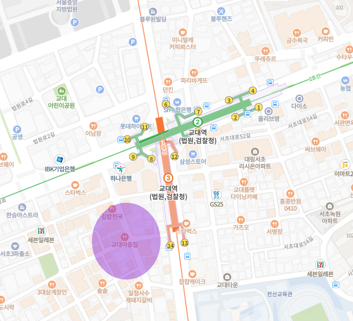 주변에 대법원, 서울중앙지방법원, 서울중앙검찰청, 서울교육대학교가 있으며, 생활편의시설 등이