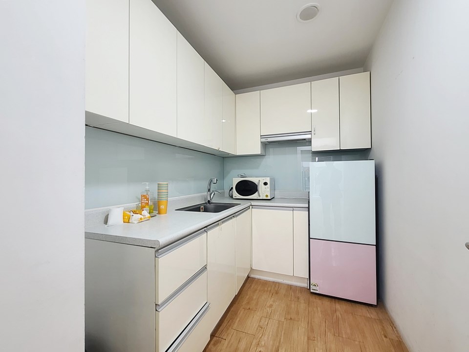 화이트톤의 벽체 마감과 우든톤 바닥이 세련되고 깔끔한 분위기의 내부인테리어가 되어 있어