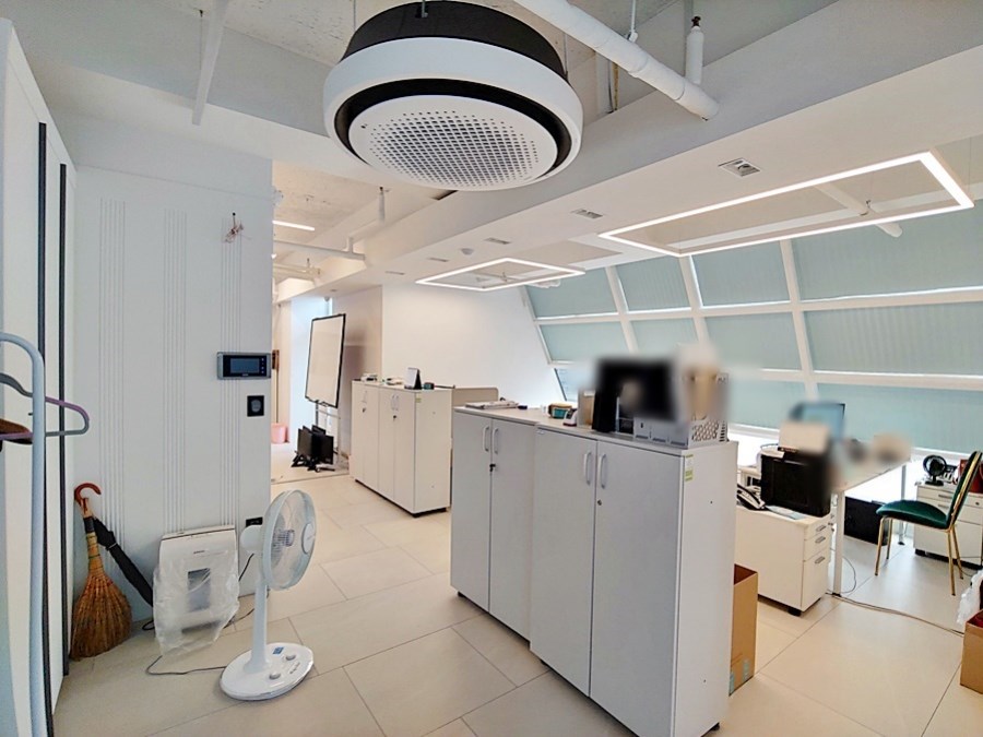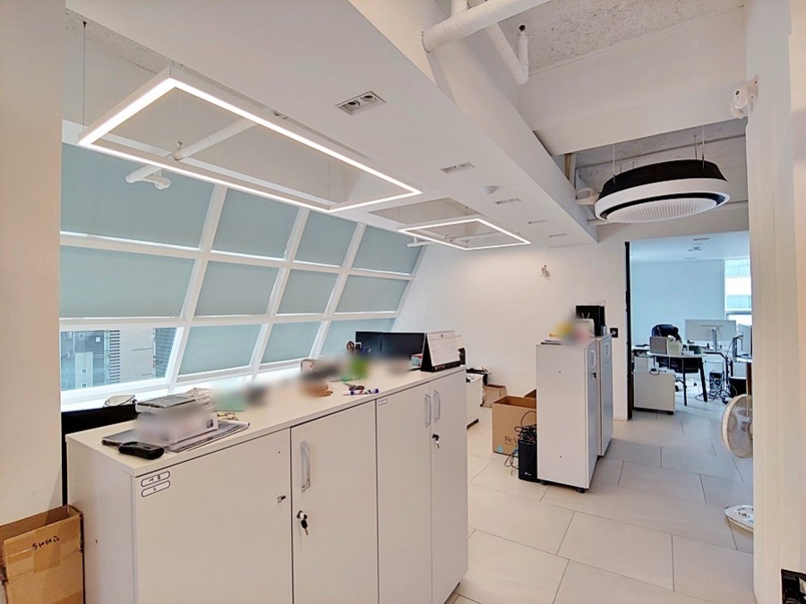 층고가 높은 노출형 천장 구조로 되어 있으며, 화이트톤의 벽채마감과 LED조명 등