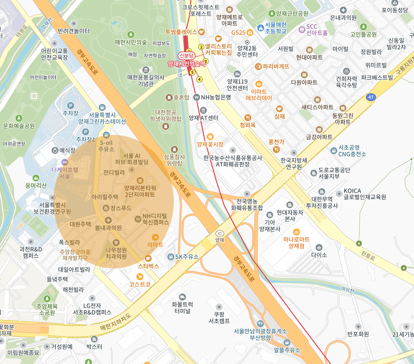 양재대로, 강남대로, 양재IC, 경부고속도로가 인접하고 있어 차량의 접근성이 우수한