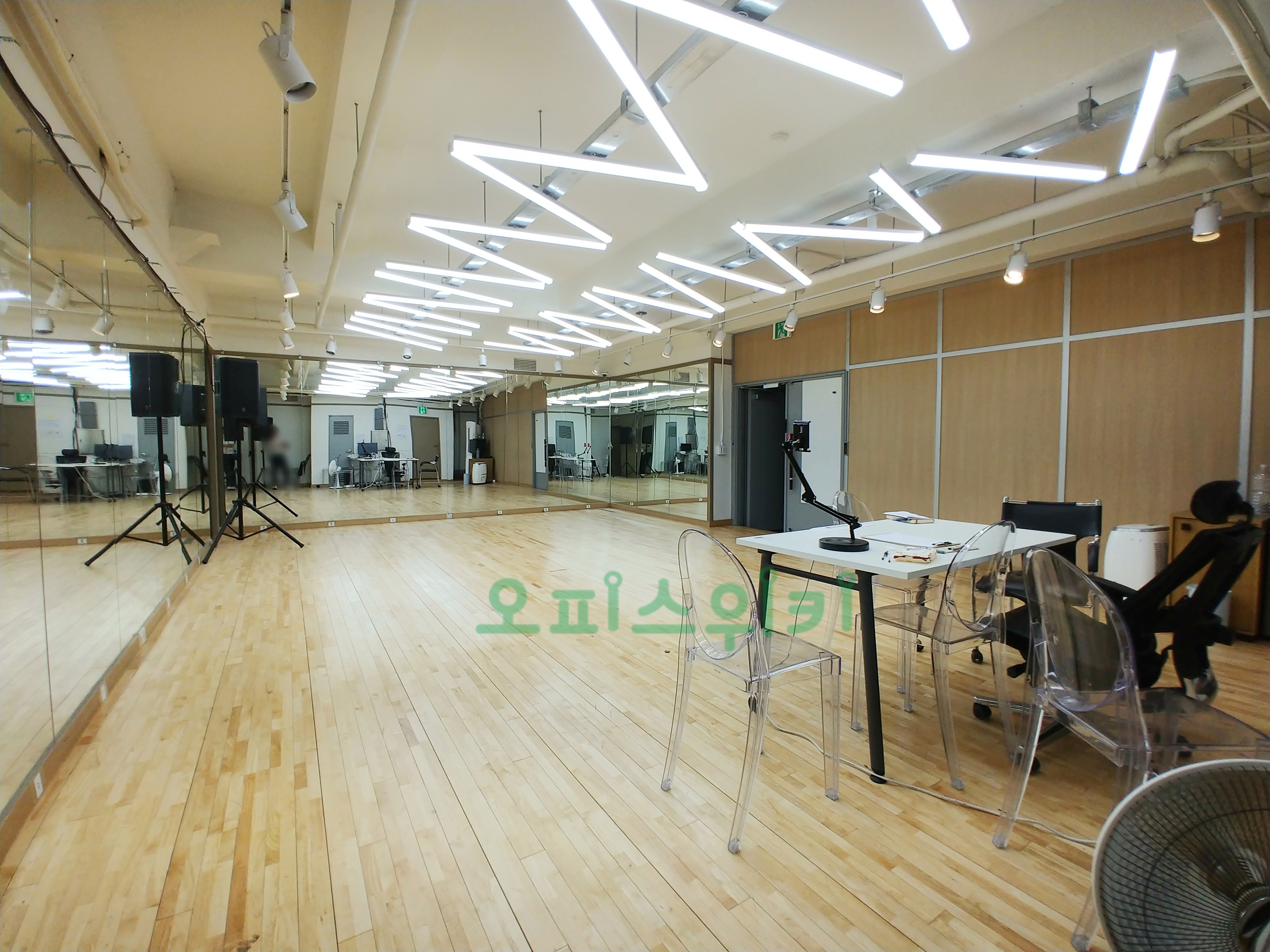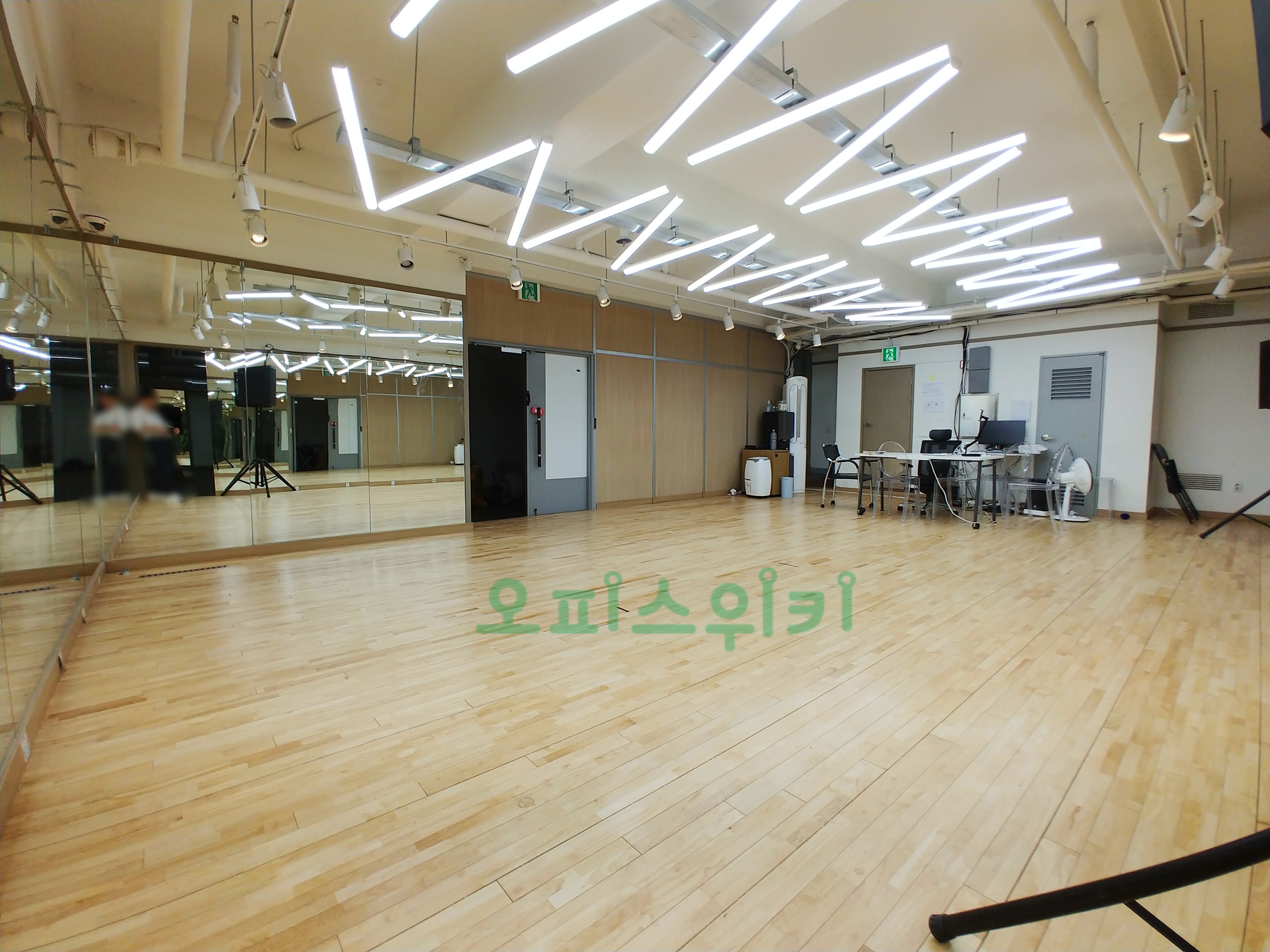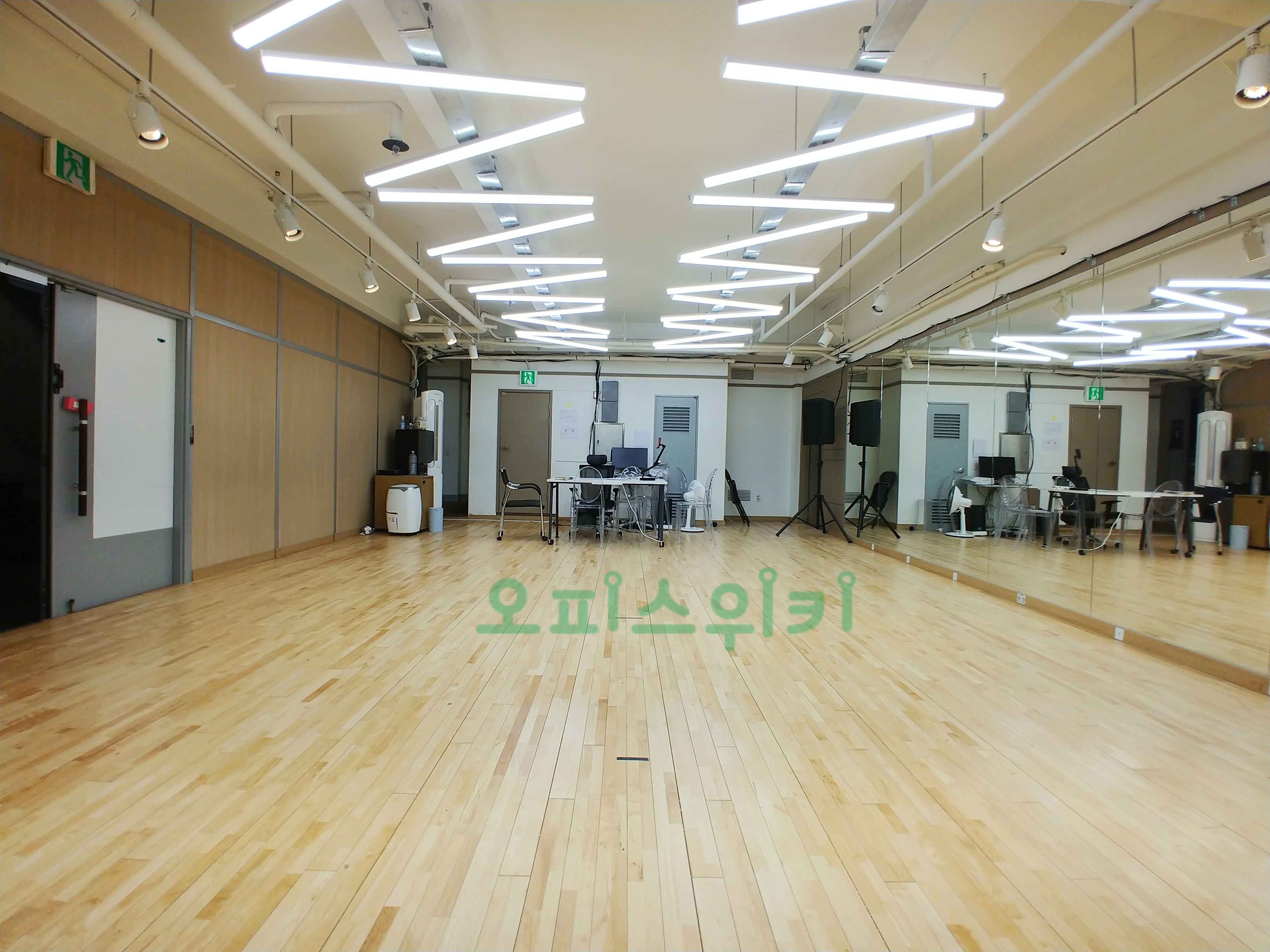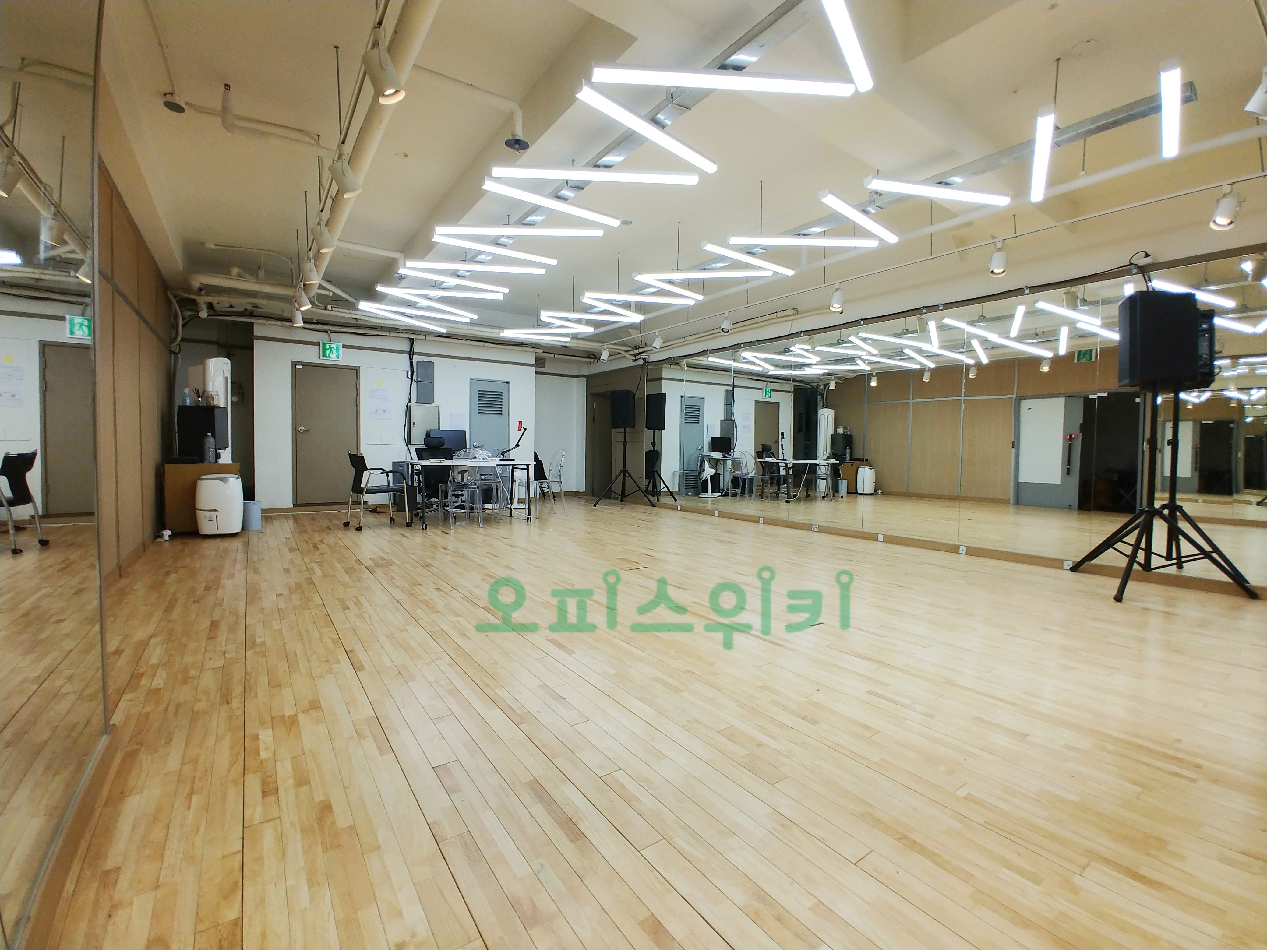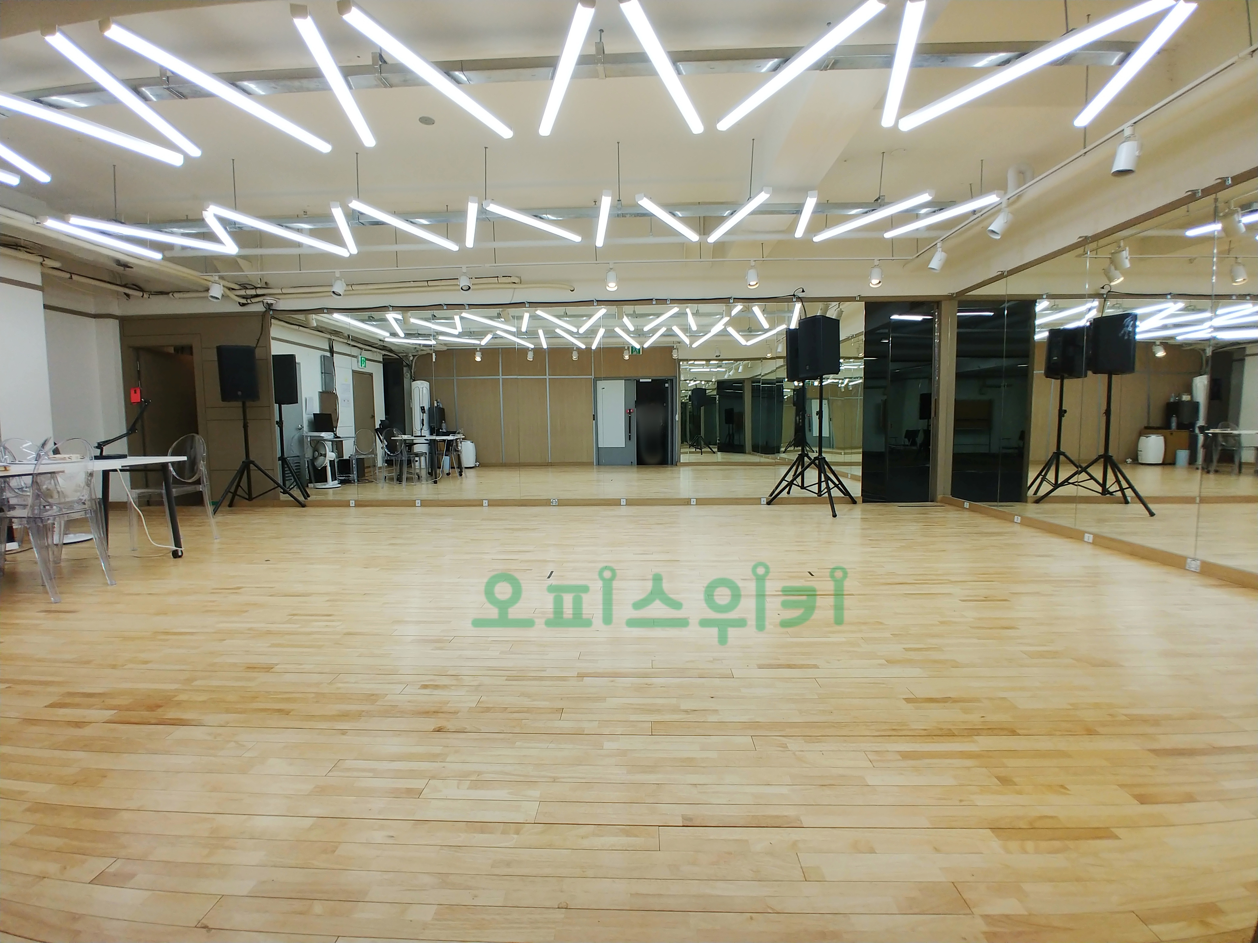 강화마루, 거울, 조명, 오디오 시스템이 완벽하게 설치 되어 있습니다.
