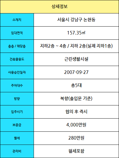 임대면적 약 47평으로 지하층 전체를 단독으로 사용합니다.