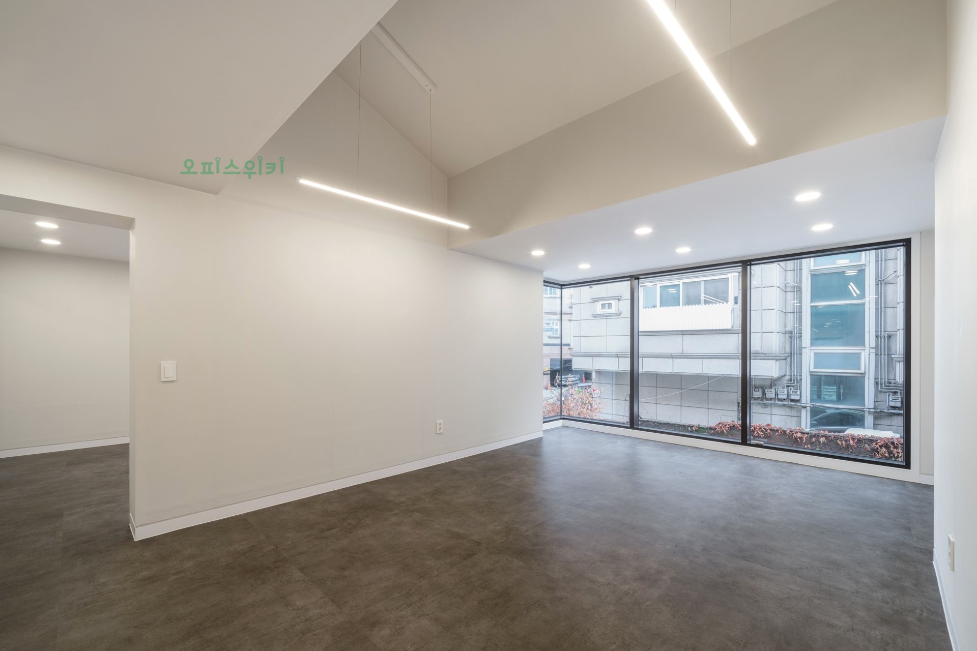 층고가 높은 노출천장 구조와 전면 통유리가 설치 되어 있어