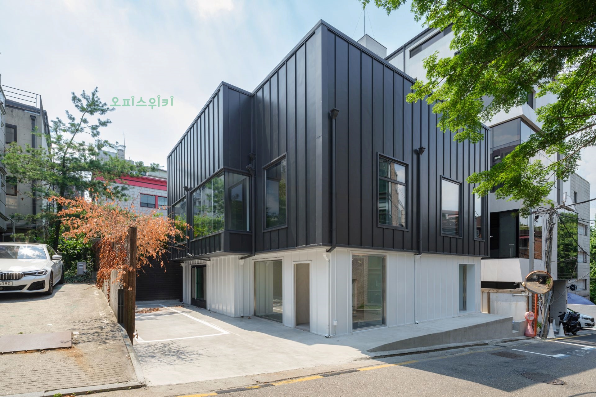 건물 앞 자주식 주차 2~3대 가능하고, 거주자주차공간(유료) 있어서