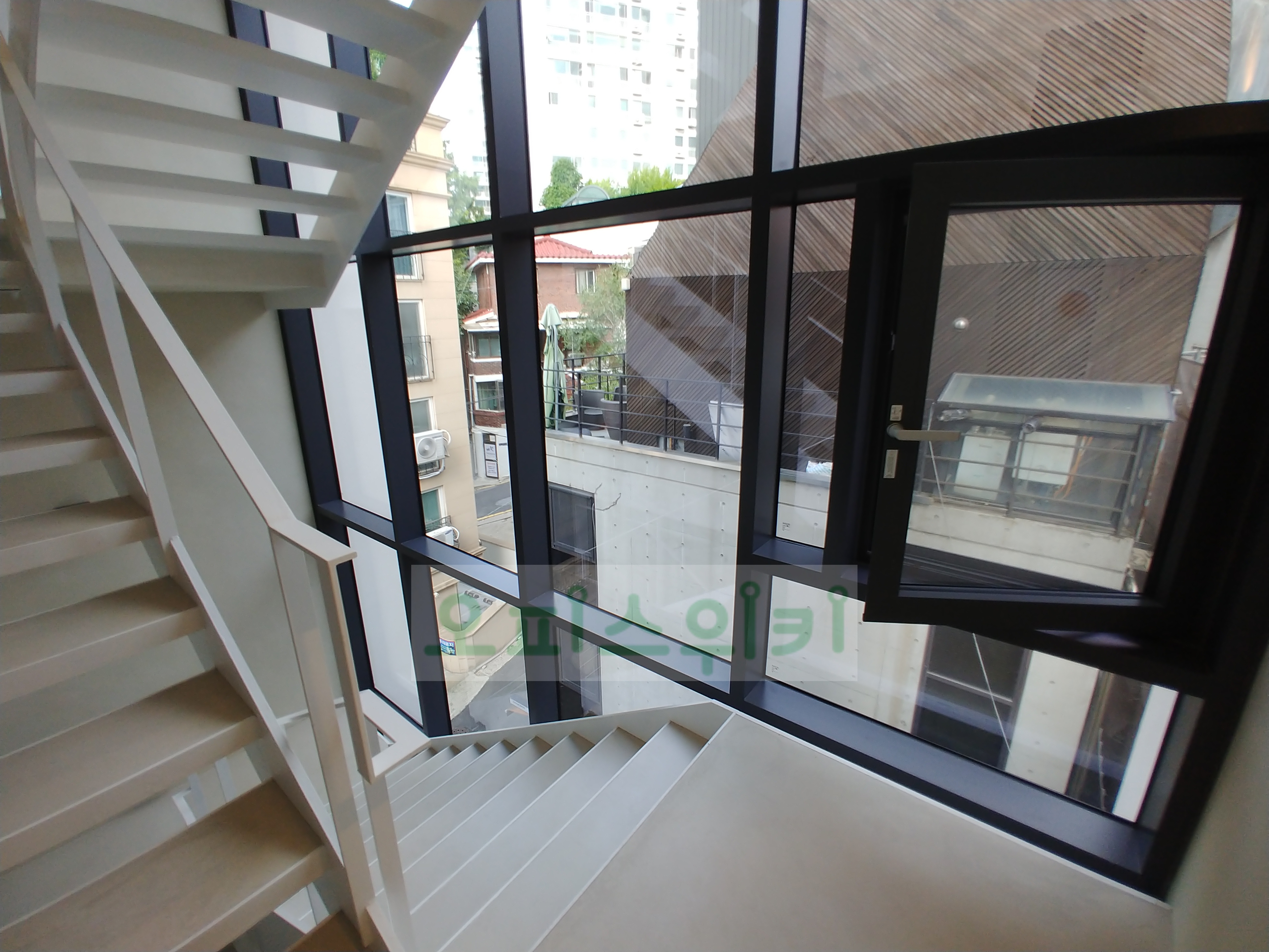 계단쪽도 통창으로 되어 있어 하루종일 채광이 되고, 중정 느낌의 사무실 계단입니다.