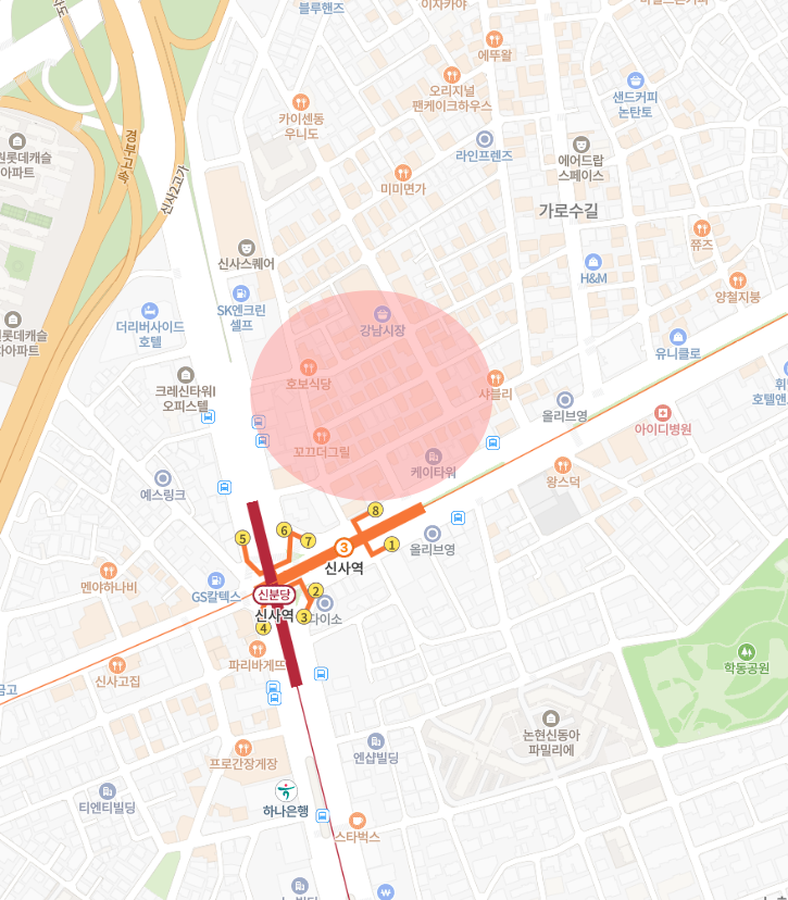 신사역, 논현역, 압구정역, 삼성역, 역삼역, 강남역, 강남구청역 등
