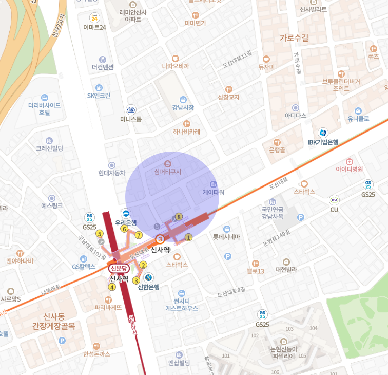 지하철 3호선 신사역 도보2분 이내로 이용 할 수 있고, 도산대로 대로변과 인접 하고 있어