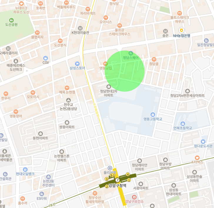 학동사거리와 인접 해 있고, 청담스퀘어 바로 앞으로 유동인구가 많이 있고, 꾸준한 수요가 있는 곳 입니다.