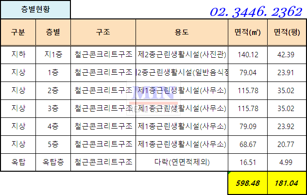 임대면적 181평으로 건물 전체를 사용 하며, 개별 층 임대면적을 위의 표 참고 하시면 됩니다.