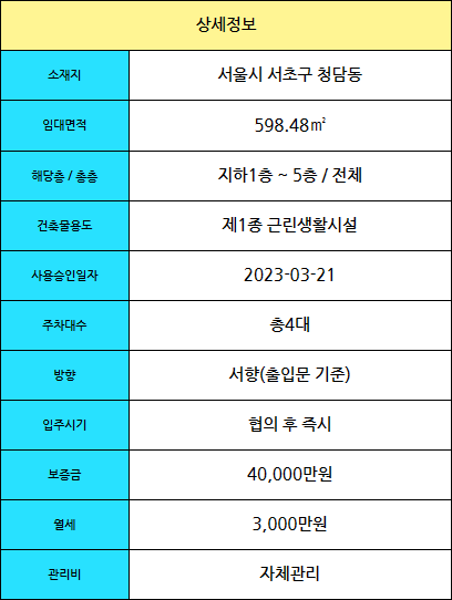 | 청담동 뷰티 헤어 스튜디오 무권리 통임대 / 주차10대 (0) | 2023.09.23 |